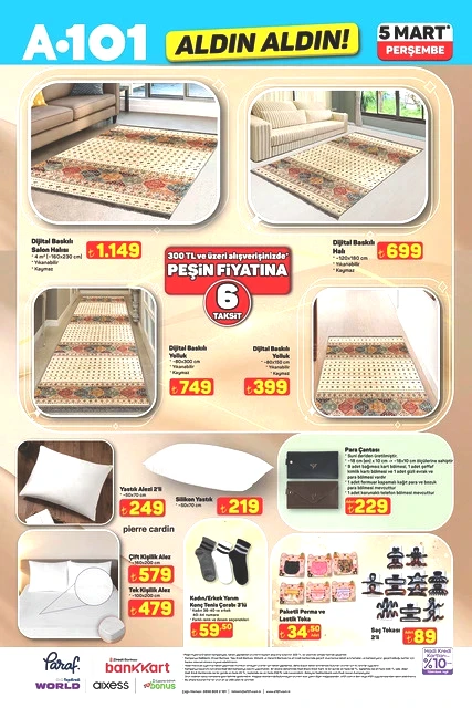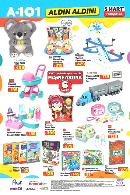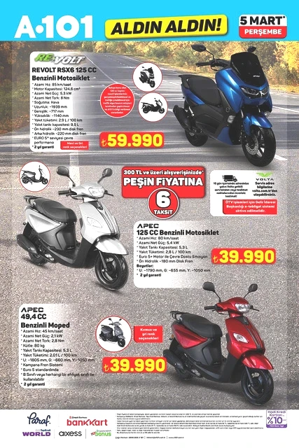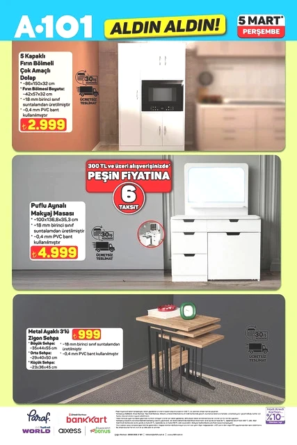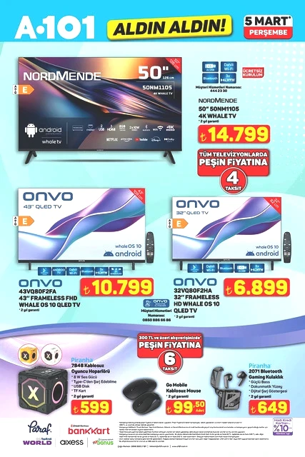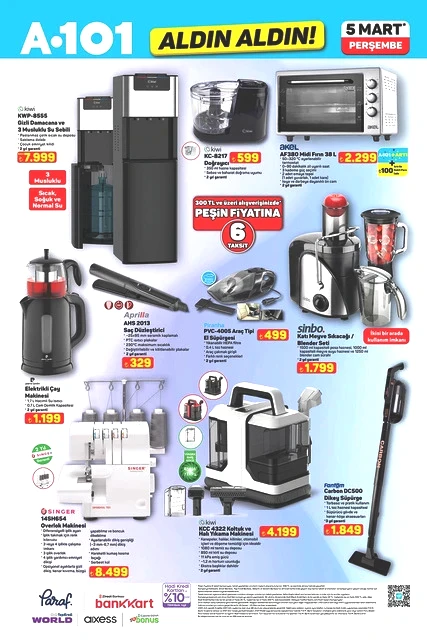 Her hafta perşembe günü duyurulan "Aldın Aldın" kampanyasına ait yeni ürün listesi açıklandı. A101’in 5 Mart 2026 tarihli aktüel kataloğunda, teknoloji aletlerinden ev yaşamına dair çeşitli alternatiflere kadar geniş bir yelpaze sunulmakta. Sınırlı stokla satışa çıkarılacak olan televizyonlar, fırınlar, süpürgeler ve motosikletler gibi dikkat çekici seçenekler, alışveriş planlarını yapan müşterilerin ilgisini çekiyor. İşte A101’in mart ayına özel perşembe kampanyasında öne çıkan bazı detaylar…
